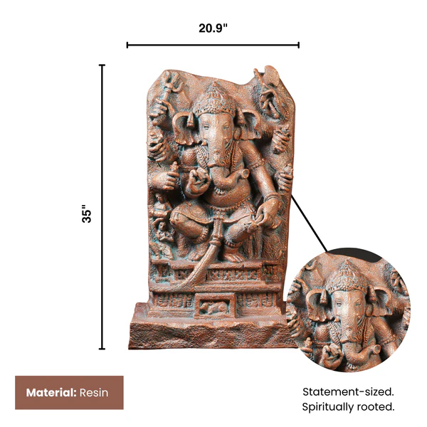 Celebrate the presence of the divine remover of obstacles with this majestic 3-feet resin idol of Lord Ganesha in his revered Vighnaharta avatar. Imposing in size yet full of serene charm, this grand statue brings together traditional craftsmanship and spiritual symbolism, perfect for your office, commercial space, entryway, or as an eye-catching antique centrepiece.