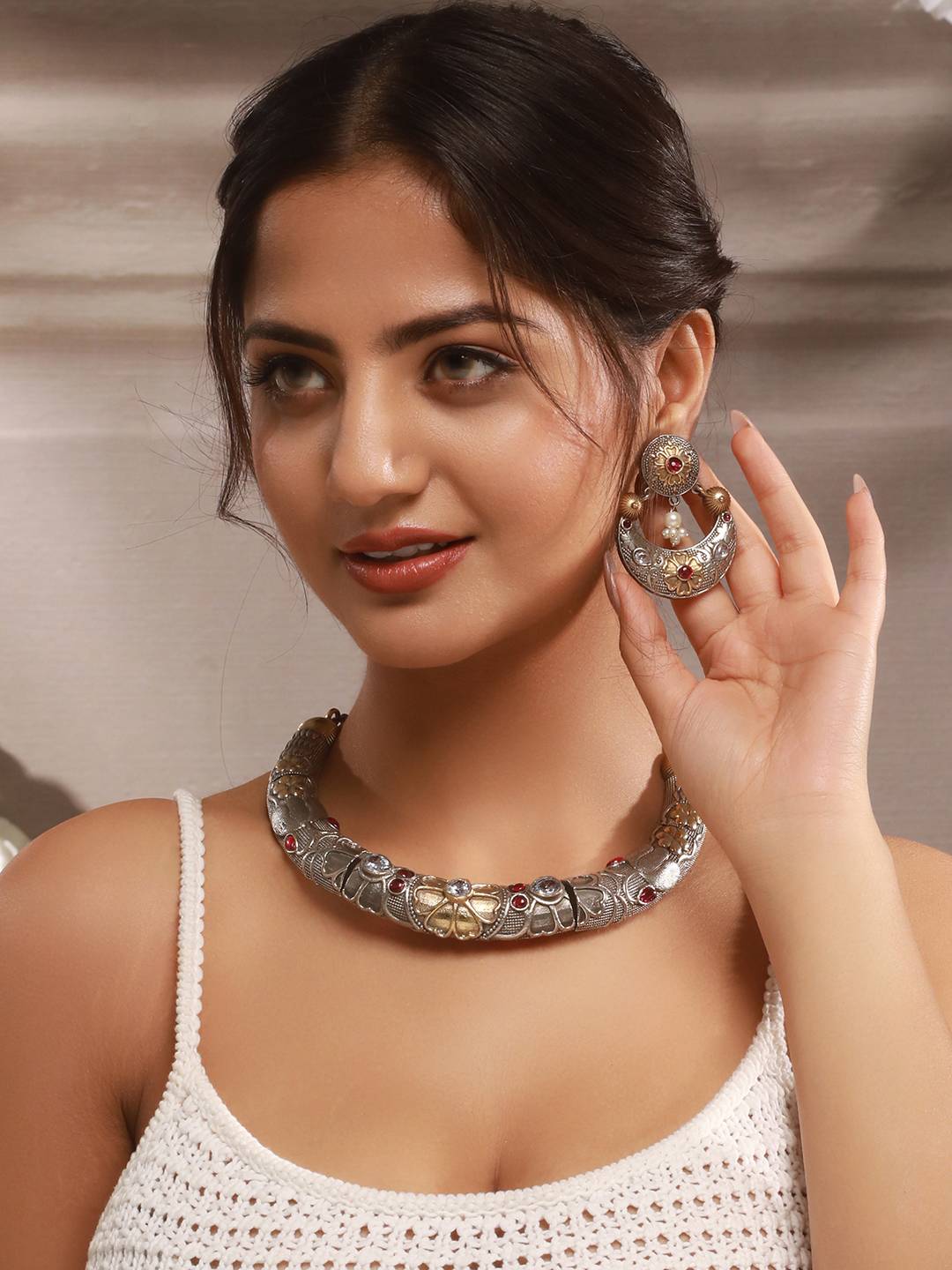 Hasli Necklace: A structured, collar-style piece (also known as Hasli in Indian heritage), with delicate floral engravings, tribal motifs, and a refined dual-tone oxidised finish—blending matte silver with hints of antique gold for rich visual depth. Lightweight yet impactful, it sits gracefully on the collarbone and adds an earthy luxe charm to any ensemble.