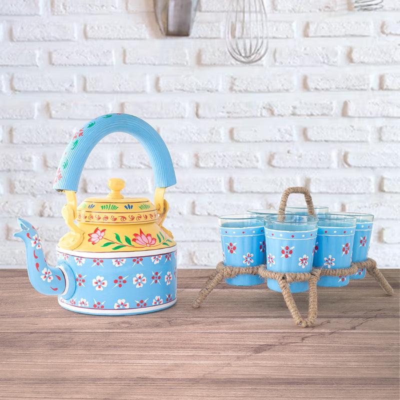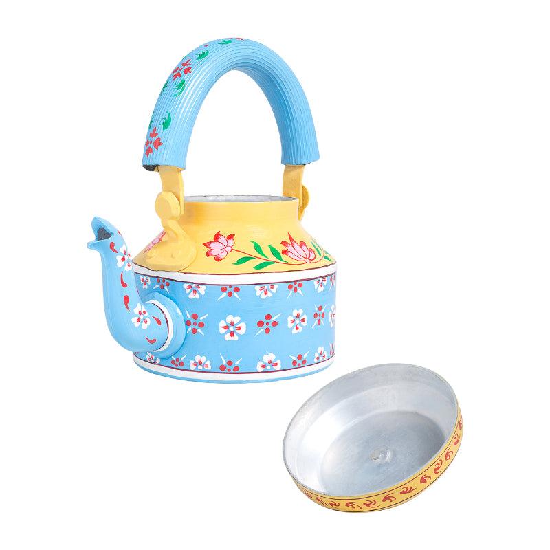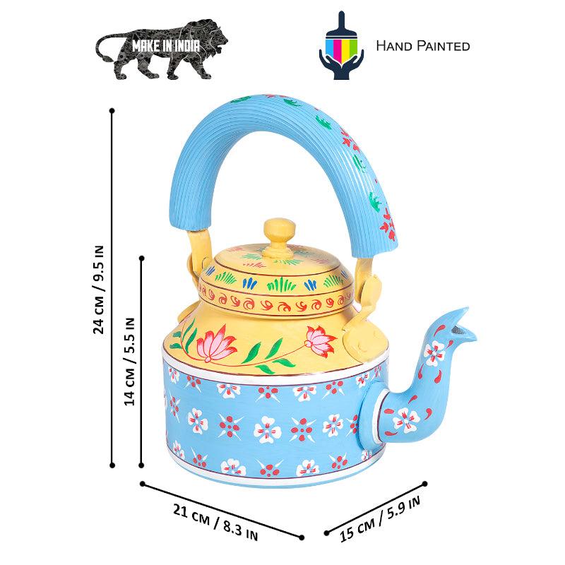 Add a dash of color and culture to your tea moments with this hand-painted decorative tea kettle, inspired by India’s vibrant street chai culture and traditional folk art. Featuring a cheerful blend of sunny yellow and sky blue, this teapot is adorned with delicate hand-painted floral motifs, making it a visual treat for your kitchen or dining space.