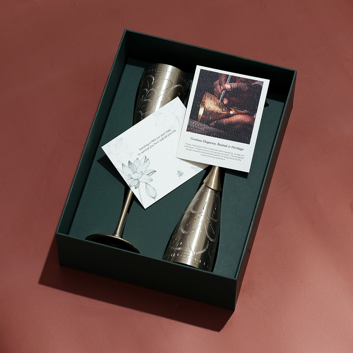 Bring home a blend of tradition and modern elegance. This handcrafted brass champagne glass set celebrates the art of slow living and refined celebrations, a perfect addition to your festive and fine-living collection.