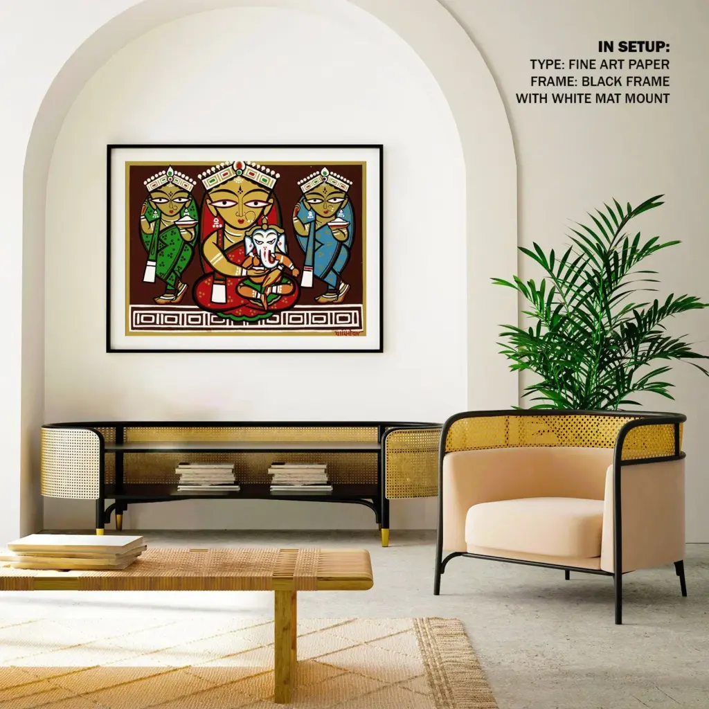 Each brushstroke is a tribute to India’s enduring visual language. Rendered in the beloved folk-modernist style of the Bengal master, this artwork captures the divine essence of the mother-son duo with warmth, power, and striking simplicity.