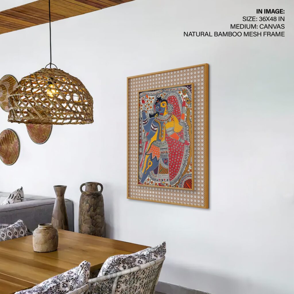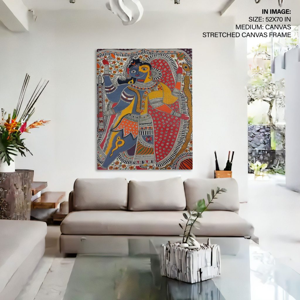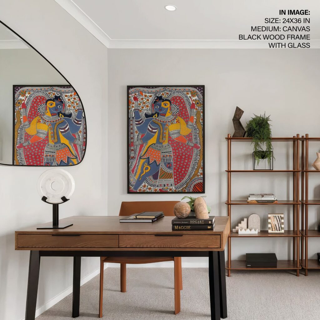 Rendered in the vibrant hues and fine linework characteristic of Madhubani art, the painting features traditional motifs such as lotus flowers, sun and moon symbols, sacred snakes, and peacocks—each carrying spiritual meaning. Natural dyes and pigments are commonly used, lending the painting an organic richness and authenticity that reflects the soul of rural India.
