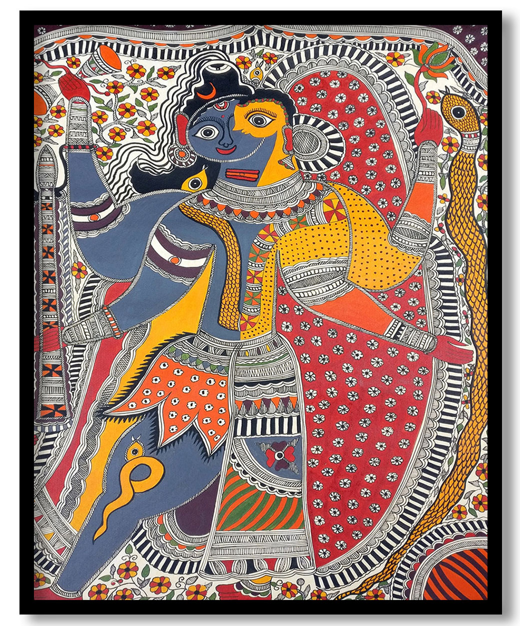 In this painting, Shiv and Shakti are often portrayed in Ardhanarishvara form, a composite figure with the left half representing Goddess Parvati (Shakti) and the right half depicting Lord Shiva. This symbolic form reflects the profound truth that creation arises only through the union of opposites, p0..ower and stillness, motion and meditation, prakriti and purusha.